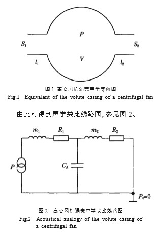 在聲學(xué)元件的線度比聲波波長小得多時(shí) , 可將聲學(xué)元件看作是集中參數(shù)系統(tǒng) 。 所以得到如圖 1 所示的離心風(fēng)機(jī)渦殼類比聲學(xué)等效圖 , 它由截面積為) 長度為 l1 和 l2 的短管與容積為S1 和 S2( 半徑為 α 、V的腔體組成 [ 6] 。 同時(shí)假定 :