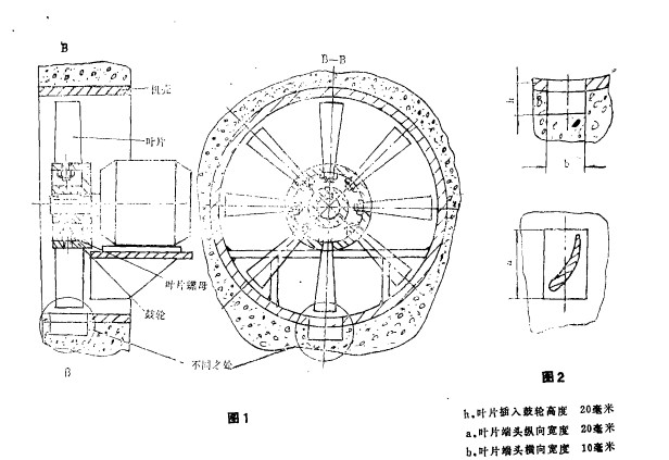 離心風(fēng)機(jī)的 葉片屬 于易損零 件, 需 常 更 換, 過去換一葉片 時(shí), 必須將鼓輪 一起拆下來 后, 才能將葉片拆下 , 換上新 葉片, 再將鼓輪 裝上去, 如圖 1 所示 , 這樣 , 費(fèi)工費(fèi)時(shí)。 為解 決此 問題, 我們 在機(jī)殼 上開 了 一個(gè)槽 口 并另加 一 個(gè)蓋板用 螺釘 固定在槽 口處 , 槽 口 尺寸如 圖 2 所 示 。
