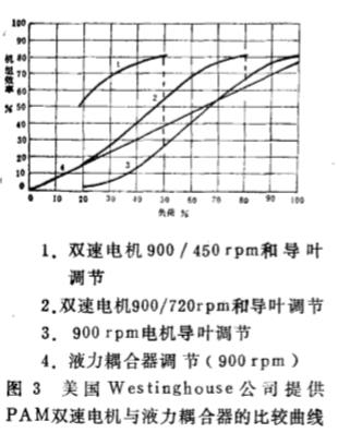 從 圖 3 所示 , 美國西 屋公司 提供的 四種 電動機驅動風機的曲線中 , PA M雙 速 電機 傳 動 調 節(jié)的效率最高 , 在90o r p m 電機 驅動 下的風 機采用入 口導 向擋板調 節(jié)在75 % 負荷 以上 , 比采用液力藕合傳動調 節(jié) 效 率 高; 在75 % 負 荷 下 PA M 雙速 電機 ( 90 0 / 7 2or p m ) 的 效 率可達 80 % , 而單一 的入 口導 向擋板和 禍 合器 傳動調 節(jié)的效 率 只有 60 % 。 因此 , 風機在高效 下 長 期運行 , 就 能節(jié)省相 當?shù)碾娏?。 為 了配 合調 峰 , 閘北發(fā)電廠 將 一 臺125 M W 機組的兩 臺吸風 機改為 雙 速 電 機 ( 740 / 5 60 r p m ) , 取 得 了 明顯的節(jié) 電效果 。 閡行 發(fā) 電 廠 一 臺36 0 t/ h 鍋爐 送、 吸 風機采用Y O T C型 液