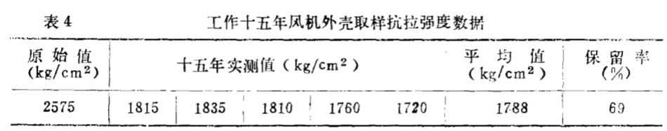 以測 得的 數(shù)據(jù)表 明風機工作十五年共主 體玻璃鋼的抗拉強度 雖然有 明顯的 下降 , 但 仍 保留69 % , 這 與試驗 理 論值是接近一致 , 所 以風機葉輪經(jīng)冷 糊修補 后該風機再繼續(xù)使 用 十五年是有可能 的。
